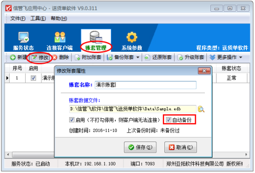 信管飛送貨單軟件、信管飛RMS、信管飛出納記賬軟件、信管飛倉(cāng)庫(kù)管理軟件及信管飛票據(jù)軟件都支持設(shè)置賬套自動(dòng)備份,我們強(qiáng)烈建議啟用自動(dòng)備份功能,以便賬套出現(xiàn)問(wèn)題的時(shí)候從賬套備份文件中恢復(fù)數(shù)據(jù)。下面我們以信管飛送貨單軟件為例詳細(xì)介紹一下如何啟用賬套自動(dòng)備份功能? 首先打開(kāi)軟件應(yīng)用中心主界面,點(diǎn)擊“系統(tǒng)參數(shù)”—》“賬套備份參數(shù)”,可