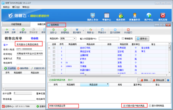 信管飛RMS軟件、信管飛倉(cāng)庫(kù)管理軟件和信管飛送貨單軟件開(kāi)單時(shí)都支持選擇系統(tǒng)內(nèi)已錄入的商品信息,進(jìn)行快速選擇商品來(lái)開(kāi)單。選擇商品時(shí)在選擇商品窗口默認(rèn)是可以顯示所有商品(圖1),但是部分用戶在選擇商品時(shí)只需要顯示此客戶相關(guān)的商品,如何設(shè)置呢?本篇文章我們以信管飛RMS 專業(yè)版軟件為例來(lái)詳細(xì)介紹一下如何設(shè)置在選擇商品窗口僅顯示客戶相關(guān)商品? 圖