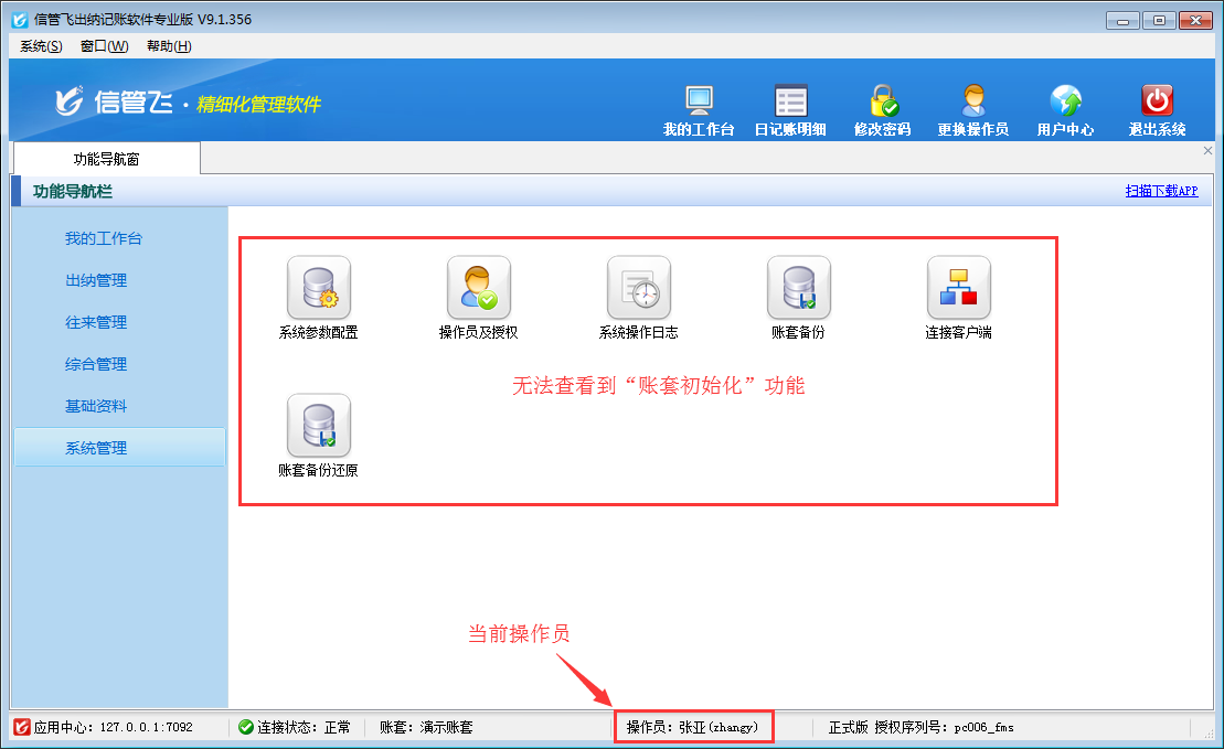 信管飛出納記賬軟件內(nèi)包含豐富的記賬統(tǒng)計表格,如現(xiàn)金賬簿、銀行賬簿、資金日(月)報表、收支類別匯總表等。如果不希望員工賬號登錄后查看到這些報表,如何設(shè)置呢?本篇文章以信管飛出納記賬軟件專業(yè)版為例演示一下出納記賬軟件內(nèi)如何設(shè)置操作員不可查看現(xiàn)金及銀行賬簿。 登錄軟件,在功能導(dǎo)航窗點擊“系統(tǒng)管理”—》“操作員及授權(quán)”,進入“操作員