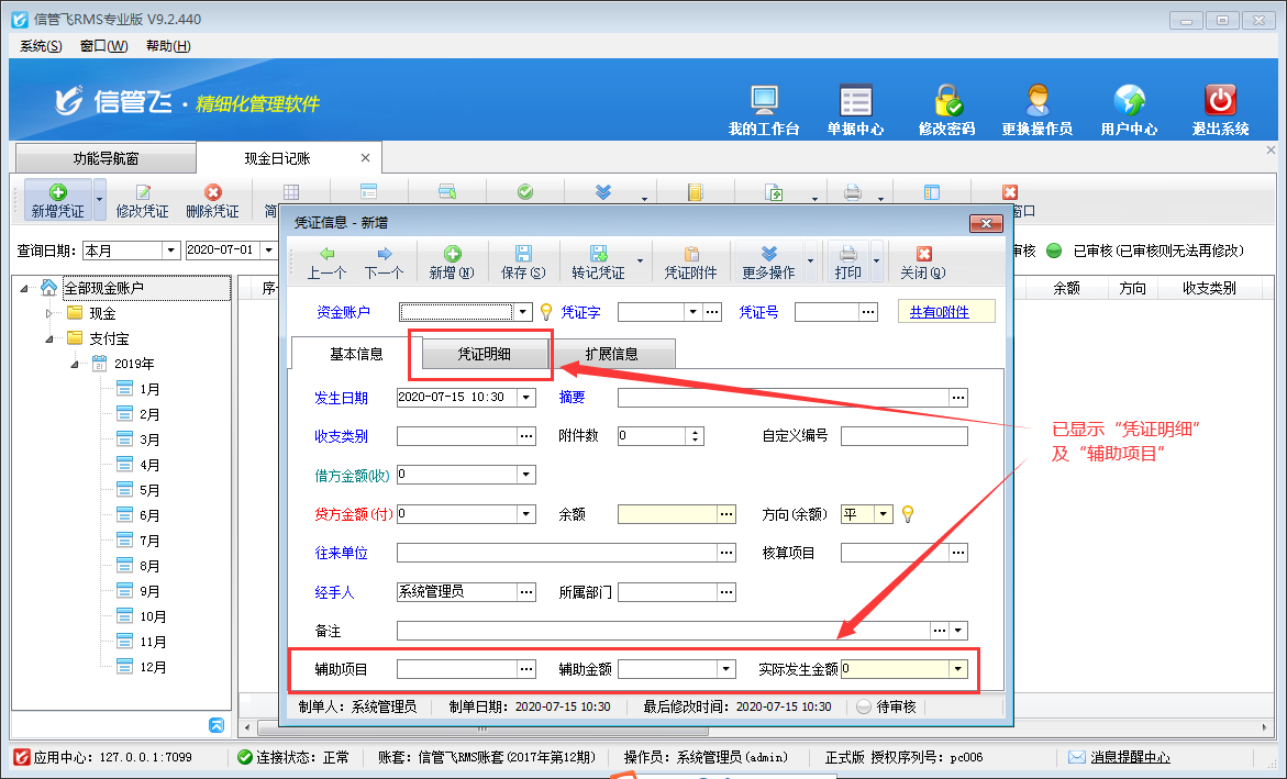 信管飛出納記賬軟件、信管飛RMS(標準版、專業版)中的出納管理模塊,在新增憑證中有的需要填寫輔助項目和憑證明細,軟件支持設置在新增憑證時顯示這些項目。下邊以信管飛RMS為例,演示一下如何設置出納憑證啟用憑證明細和輔助項目。 在功能導航窗點擊“系統管理”—》“系統參數配置”—》“出納參數”打開出納參數配置界面,然后啟用參數“出