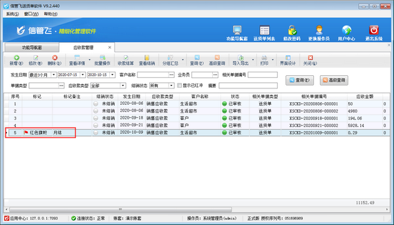 信管飛送貨單軟件支持管理客戶的應收款信息,可對應收款信息標記備注內容,本文演示一下具體操作步驟。 軟件登錄后,點擊“業務處理”—》“應收款管理”可以打開應收款管理界面,如下圖所示,應收款管理界面可以查看客戶的應收款信息及詳細結銷情況,應收款記錄一般由送貨單自動生成,其類型為“銷售應收款”,或者由退貨單自動生成,其類型為“銷售