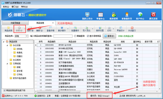 信管飛送貨單軟件、信管飛RMS(進銷存管理軟件)、信管飛倉庫管理軟件等都支持維護商品信息和允許設置多個操作員登錄軟件,為了避免開單時不同操作員同時新增商品出錯,軟件支持設置操作員權限,可以設置操作員開單時不能直接新增商品信息只能選擇添加好的商品信息。 以信管飛倉庫管理軟件為例,示范下如何設置操作員不能新增商品信息。