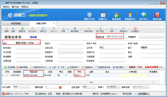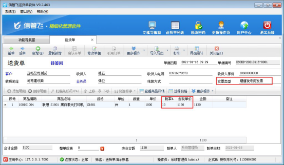 信管飛送貨單軟件、信管飛RMS軟件等都支持打印單據,軟件內置了十幾種打印模板以供使用。默認打印模板的金額是按財務樣式進行顯示的,默認金額格式是按7位顯示,只顯示到萬,如果出現金額超過萬位會顯示不出來(如下圖所示),本文以“信管飛送貨單軟件”為例,示范下如何修改金額樣式的顯示數字個數。 打開送貨單開單界