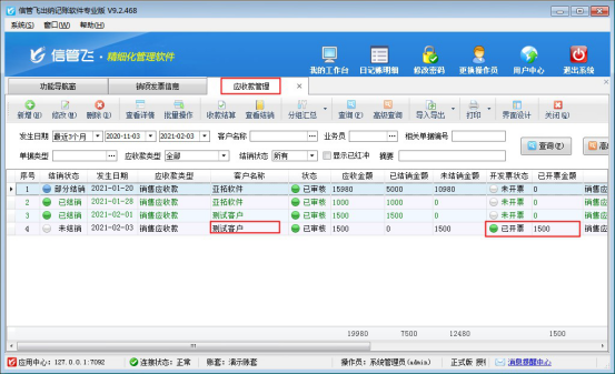 此文章演示視頻觀看鏈接:出納軟件銷項發票如何關聯應收款演示視頻 信管飛出納專業版支持直接登記應收應付款,并且支持對登記的應收應付款開對應的進銷項發票功能,對已開發票的應收應付款,在應收應付款管理界面可顯示開票狀態,方便后期查詢。 示范下銷項發