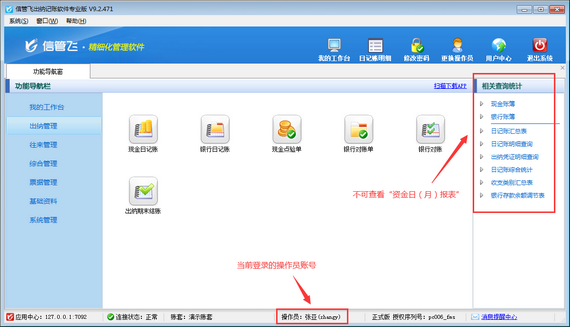 信管飛出納記賬軟件內包含豐富的記賬統計報表,如現金賬簿、銀行賬簿、資金日(月)報表、收支類別匯總表等。如果不希望員工賬號登錄后查看到這些報表,如何設置呢?本篇文章以信管飛出納記賬軟件專業版為例演示一下出納記賬軟件內如何設置操作員不可查看資金日(月)報表? 登錄軟件,在功能導航窗點擊“系統管理”—》“操作員及授權”,進入“操作