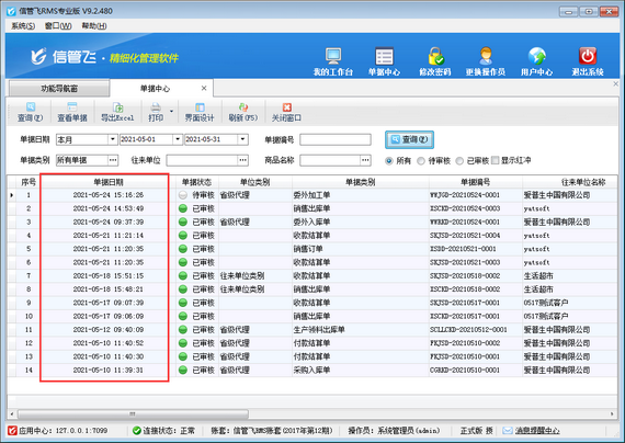 信管飛RMS是集采購管理、銷售管理、庫存管理、往來應收應付款等一體化的進銷存管理軟件,軟件支持單據中心功能,在單據中心內可以查詢到軟件內所填開的所有業務單據,可以根據單據日期、單據編號、單據類別、往來單位、商品名稱、審核狀態等信息查詢所需單據,查詢結果默認是根據單據日期正序顯示,如下圖所示。 如需設置單據中心按單據日期倒敘顯