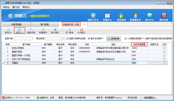 信管飛RMS軟件、信管飛送貨單軟件等支持管理應收款,有客戶存在已收貨未付款情況,對此種情況的客戶,可設置一個應收信用額度,在客戶的應收信用額度內可先收貨后付款。軟件支持批量添加客戶的信用額度,不需要在客戶信息中逐個打開進行修改。 本文以“信管飛RMS標準版”進行示范,如何批量維護客戶的信用額度。&nb