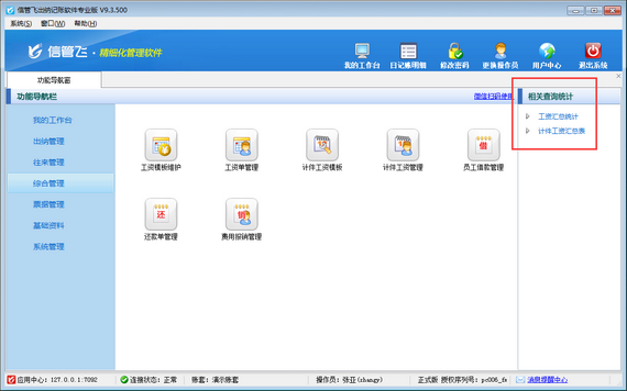 信管飛出納記賬軟件內支持計件工資管理功能,可以對公司內部根據計件進行核算工資的員工工資進行管理,本篇文章介紹一下出納記賬軟件內如何設置操作員不可維護計件工資模板? 在功能導航窗點擊“系統管理”—》“操作員及授權”,打開操作員管理及授權界面,選擇操作員“張亞”,在其右側的功能模塊權限內選擇“綜合管理”模塊,將“計件工資模板”的